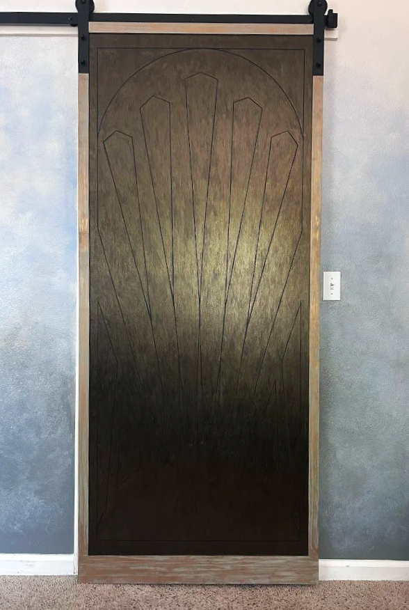 Barn door with metallic finish and art deco inspired design