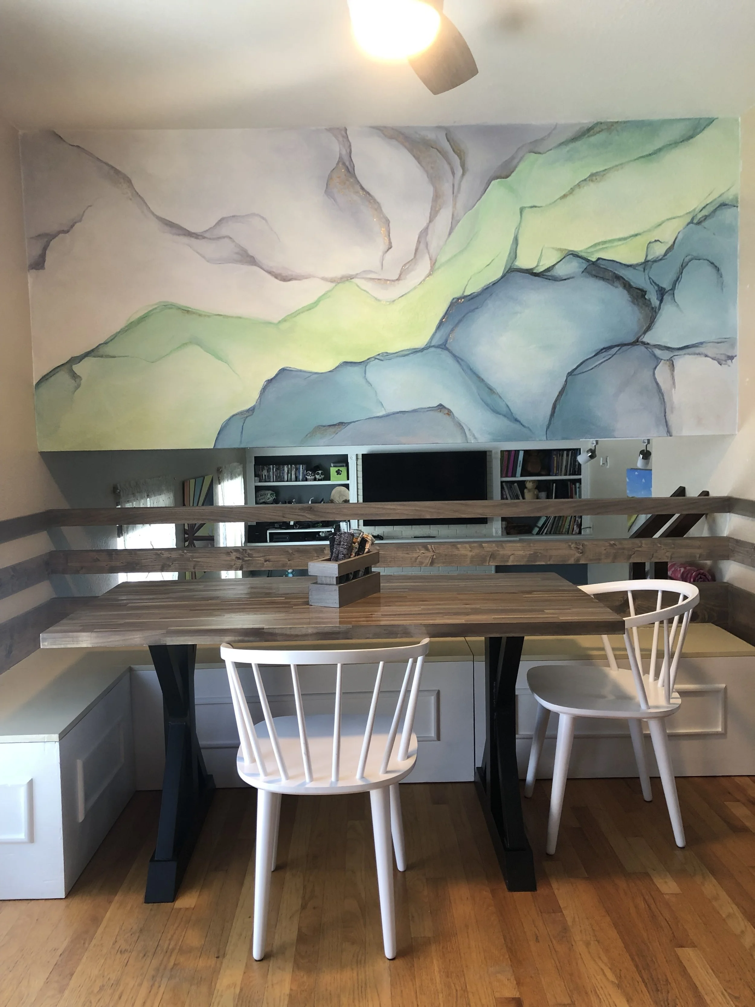 Marble slab inspired design with metal leaf specks. Custom dining table and bench seating with storage.