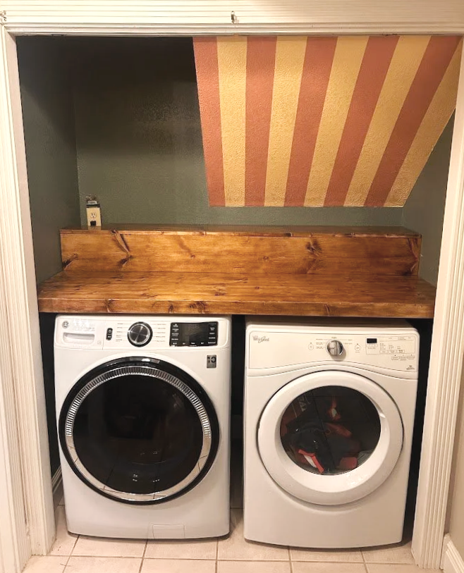 Washroom shelving cap, fully removable, with painted wall design.